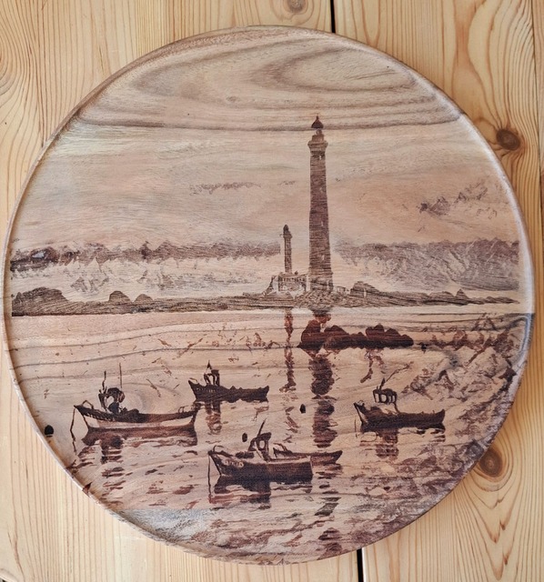 Plateau de service rond en acacia, vernis alimentaire 3 couches, j’ai moi même pris la photo du phare de l’ile vierge à Lilia-PLouguerneau puis je l’ai gravée sur le support en bois.